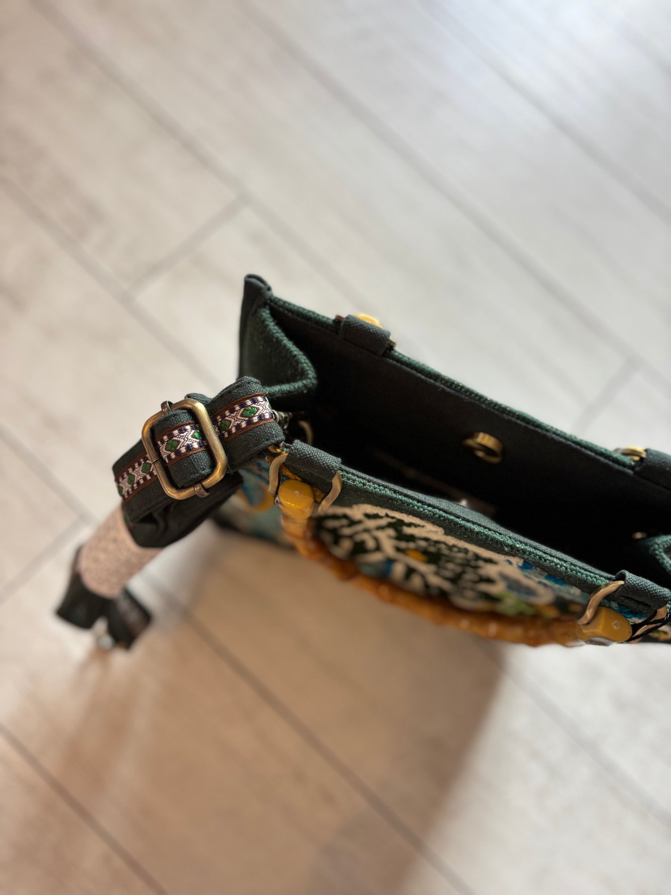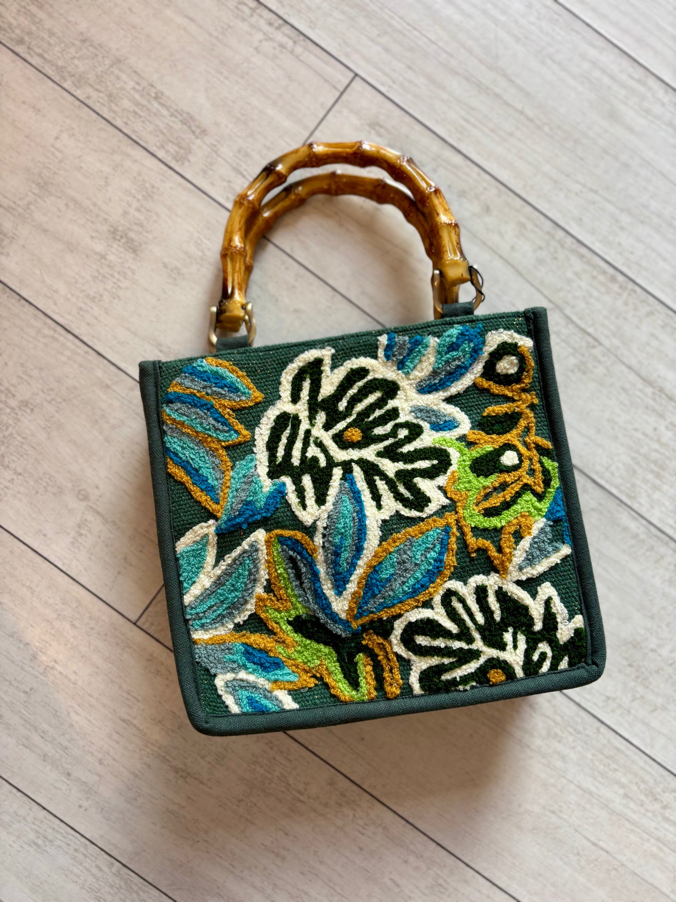 Introducing the Evergreen Monstera Embellished Crossbody Bag, a stunning accessory that combines practicality and style. Handcrafted with care, this mini tote features hand-held straps for easy carrying, and a detachable crossbody strap with lace detailing for versatile wear. The bag is made with hand-woven jacquard, a durable and high-quality material that adds a touch of elegance to the design. The front of the bag is hand-embellished with a tropical pattern of monstera leaves, adding a fashionable flair to the bag's aesthetic. The magnetic button closure ensures that your belongings stay secure while you're on the move, making it a great choice for everyday use.