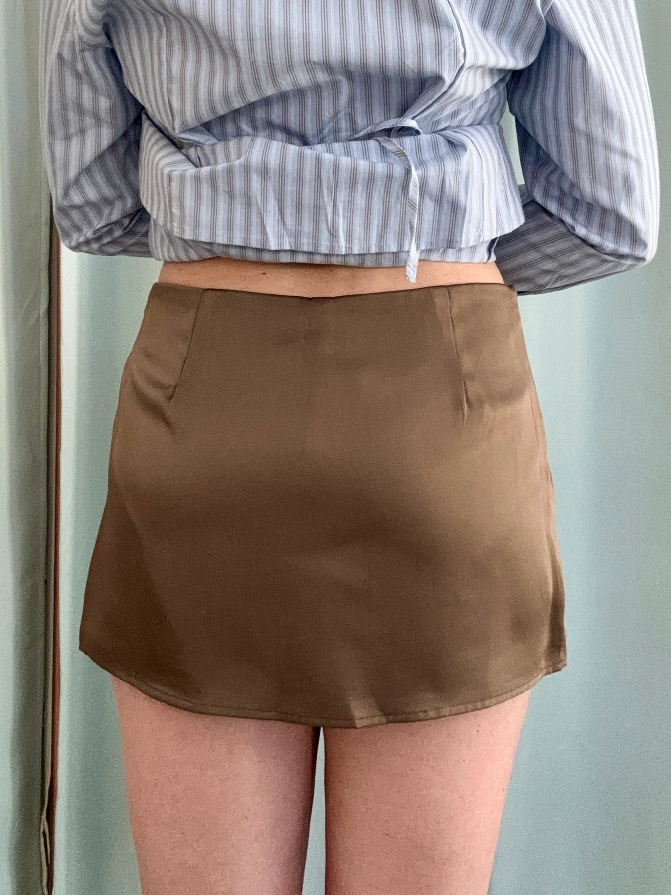 The Dark Taupe Skort is here to serve silky smooth vibes with a side of sass. This rich taupe skort brings that luxe sheen and flirty fit, all while secretly keeping you covered. Designed in a dreamy satin-like fabric this mini skort gives you the best of both worlds. Looks like a skirt, plays like shorts!