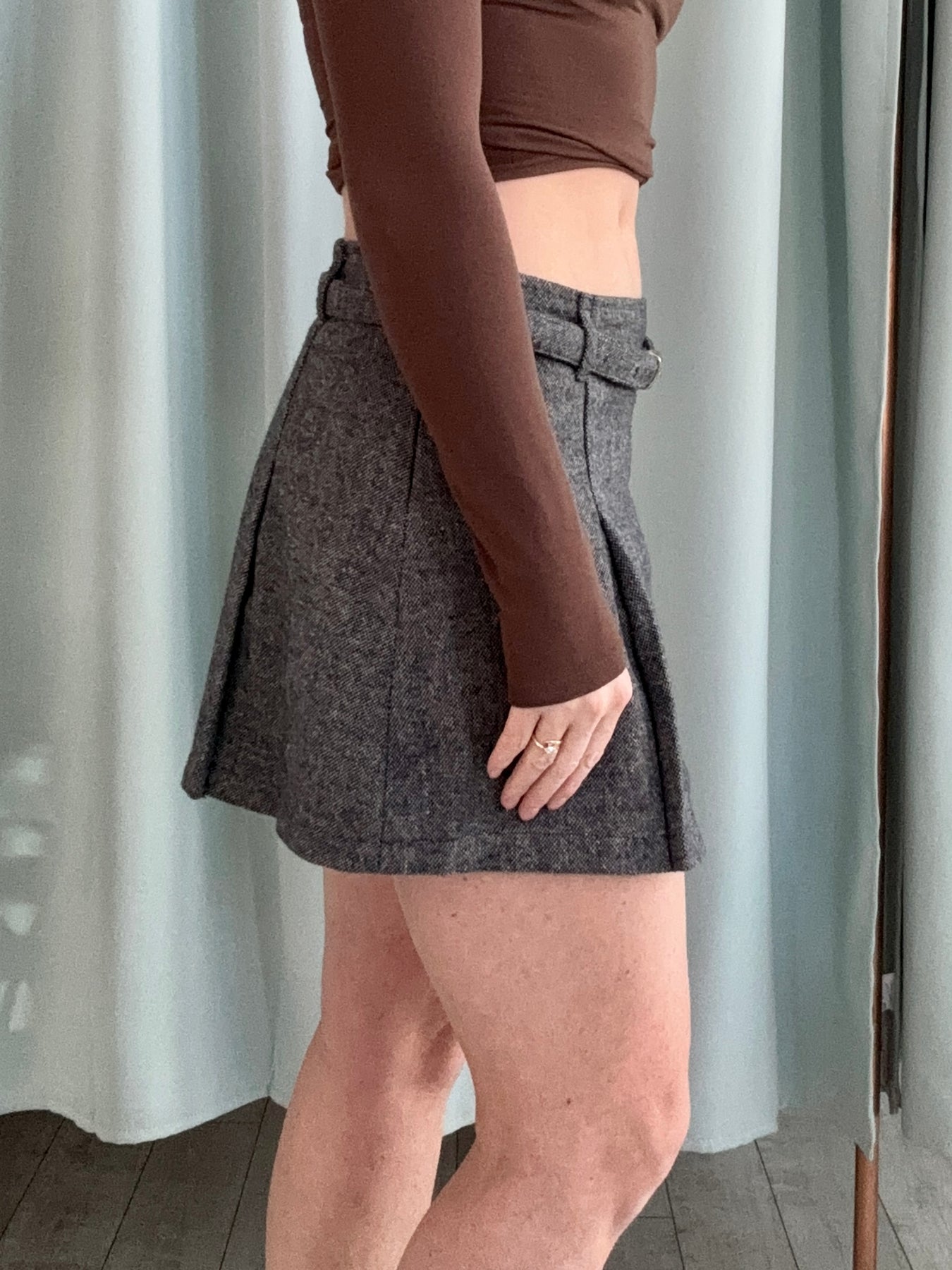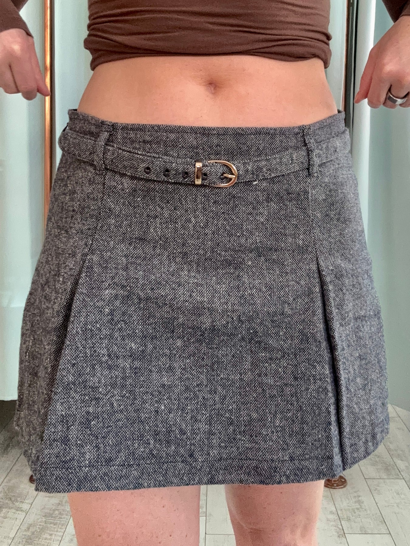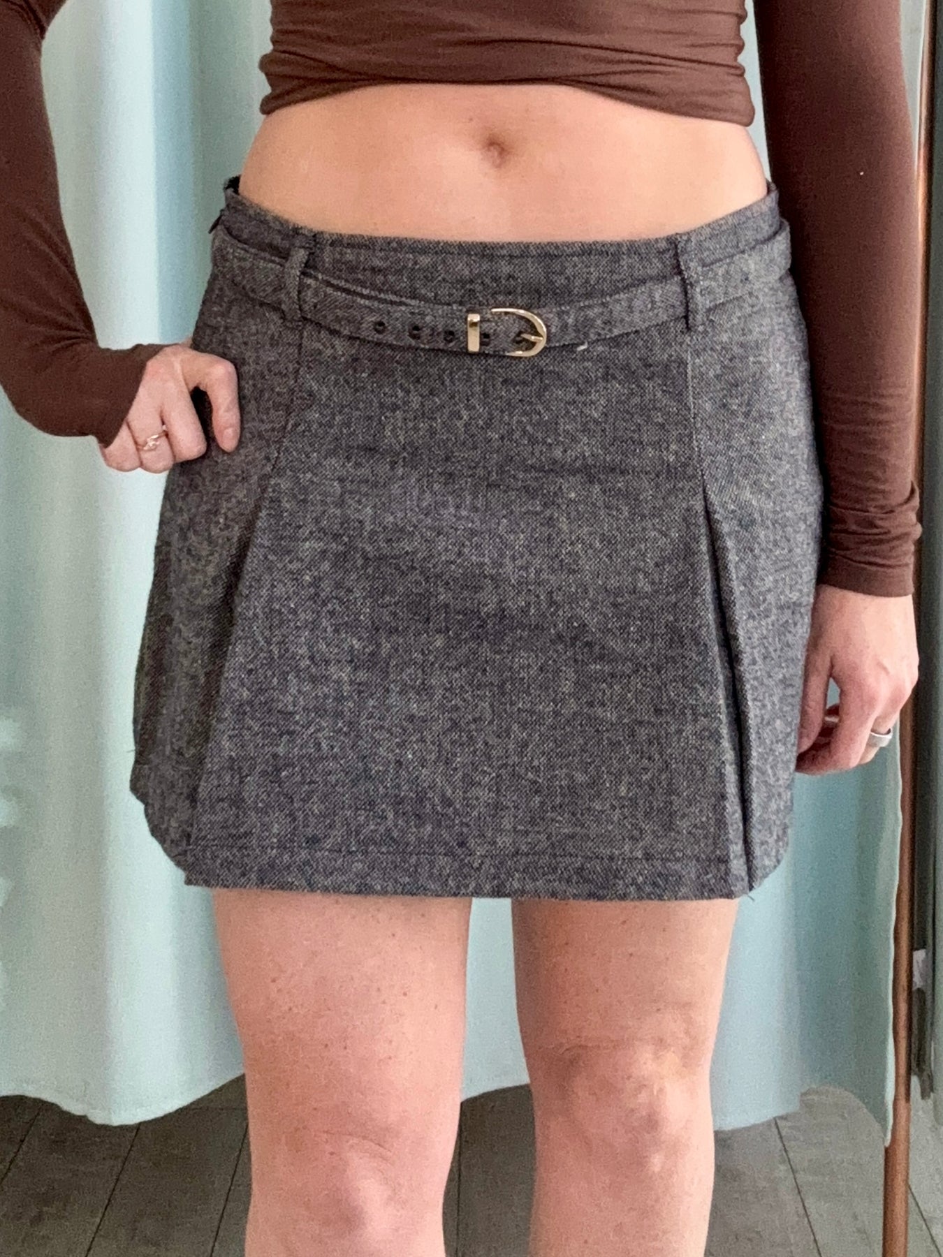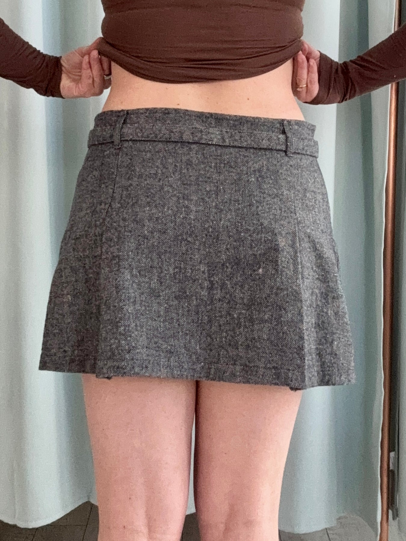 This skirt is your effortless blend of structure and sophistication. With its soft gray hue and flattering belted waist, it brings a polished, tailored feel to any outfit. The built-in belt cinches you in just right, giving definition without sacrificing comfort. Whether you’re pairing it with a crisp blouse for work or a fitted tee for weekend plans, this skirt nails that “put-together without trying too hard” vibe.