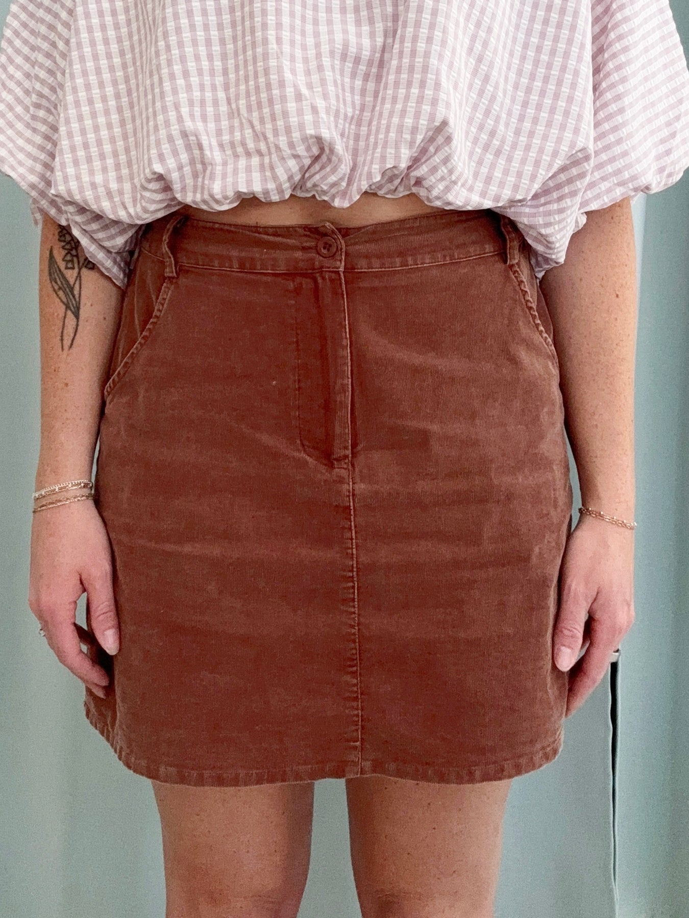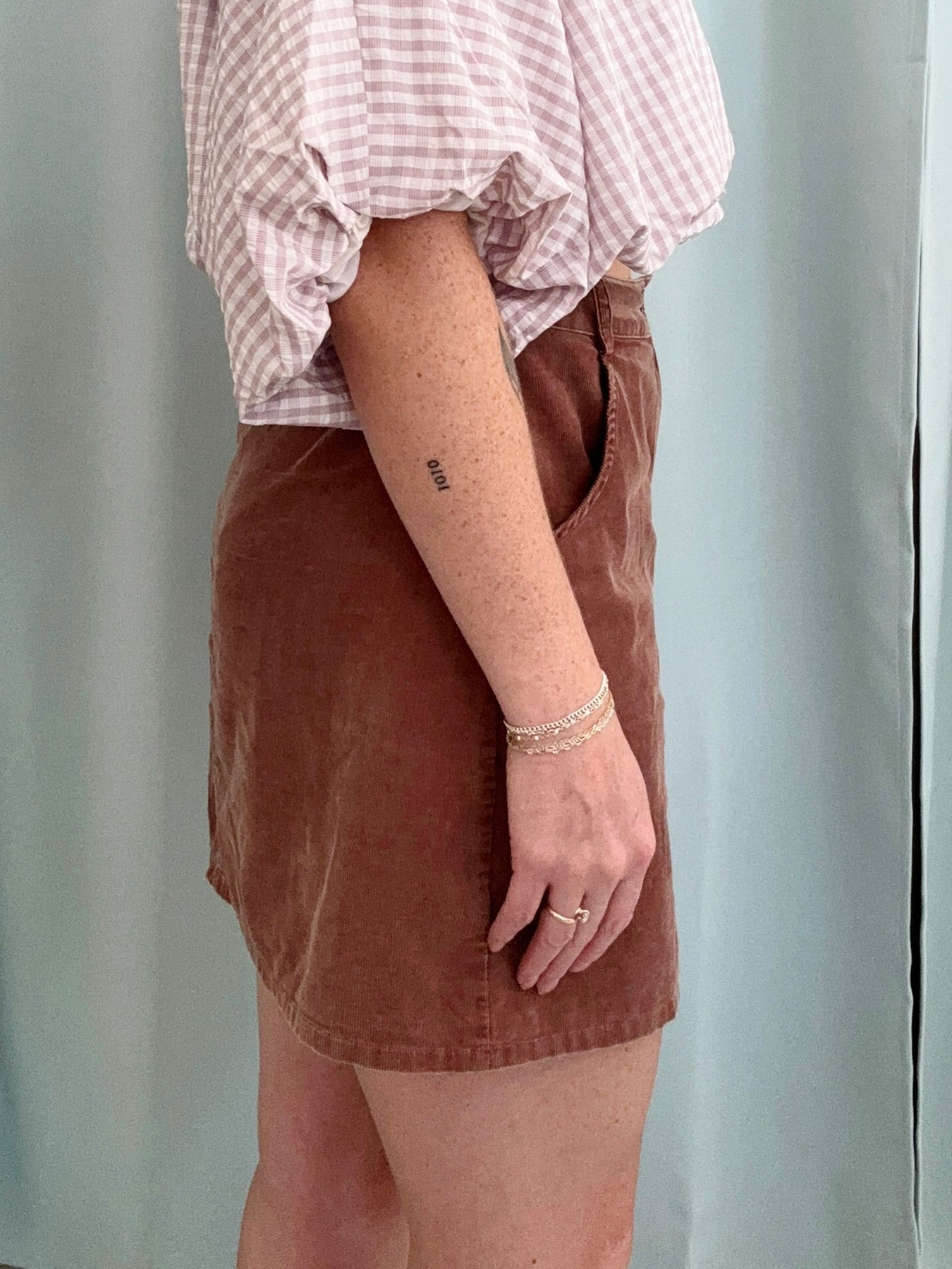 This brown mini skirt is giving cool-girl fall energy with classic charm. Designed with a soft corduroy-inspired texture, it’s structured but comfy. The earthy tone makes it a go-to for pairing with chunky knits, baby tees, or tights and boots once the weather cools.