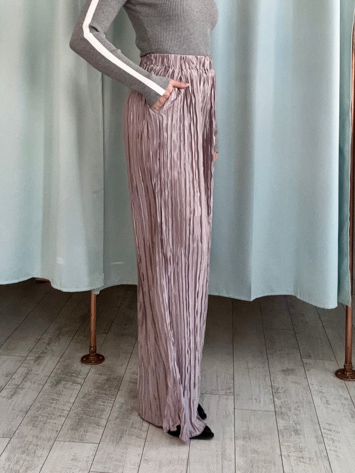 Our Shine Elastic Pant beauties bring the party with their silky shine, dreamy rose hue, and pleated texture from top to bottom. They're that extra but effortless piece your wardrobe's been craving.