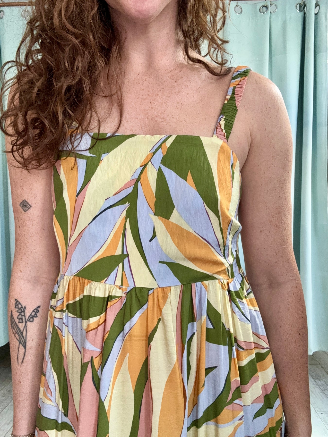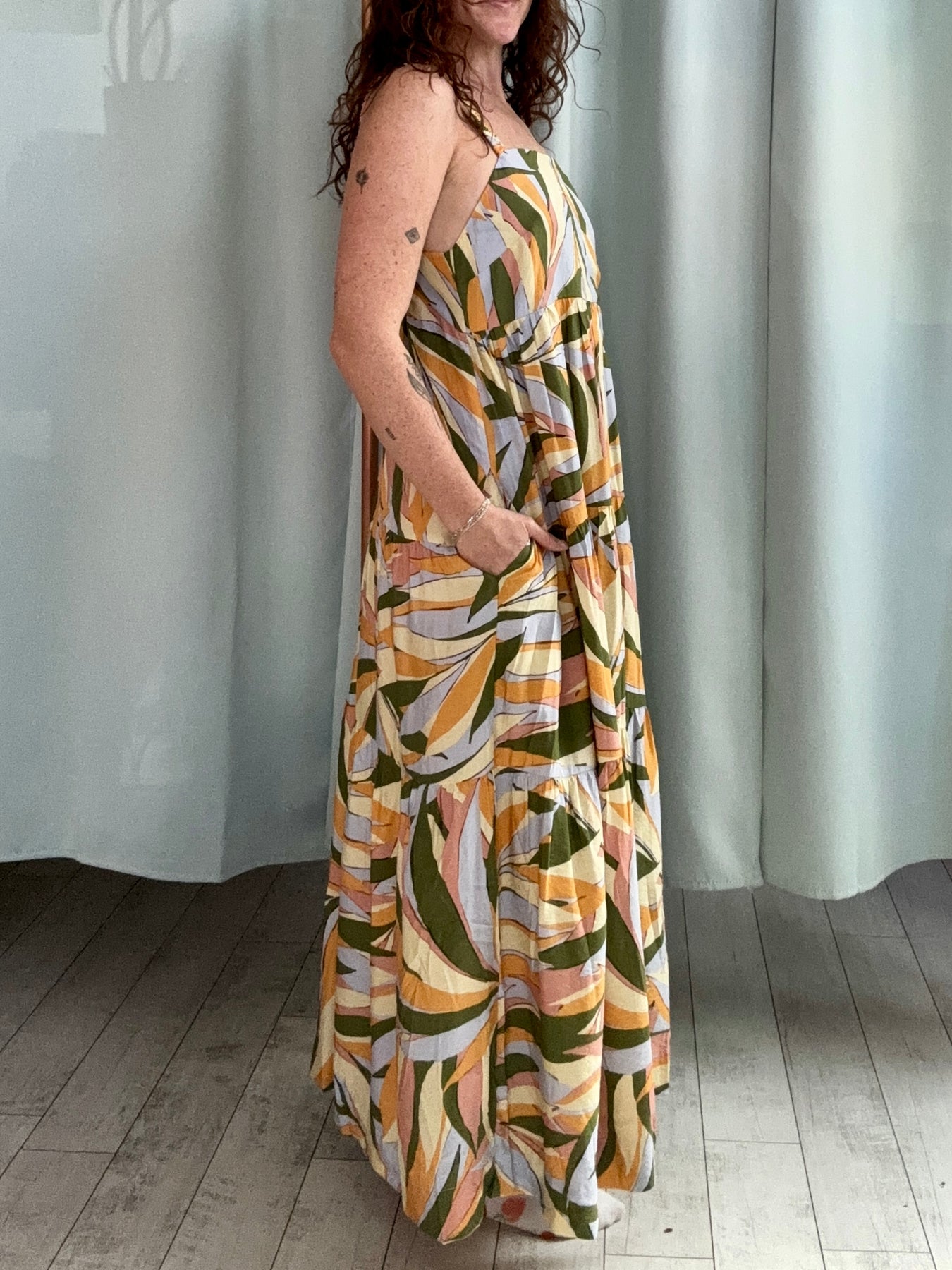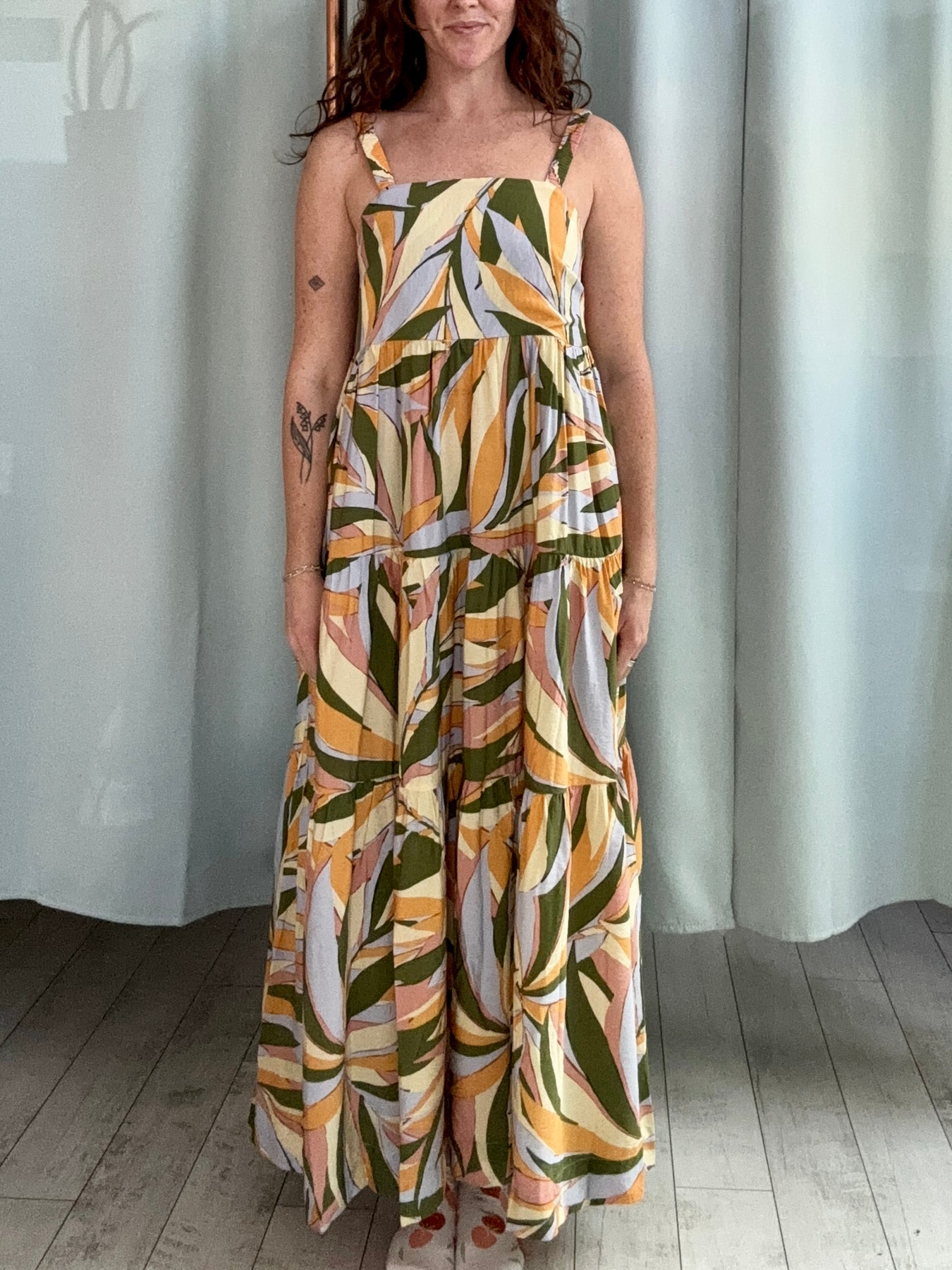 The Multi Palm Maxi is a vibrant, sun-soaked dream. Featuring an olive, yellow, orange, and pink palm print, this maxi dress brings tropical energy to every step. With a flowing silhouette, it’s effortlessly breezy while still feeling polished.
