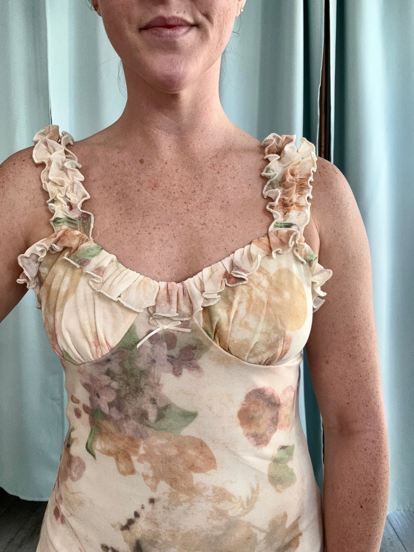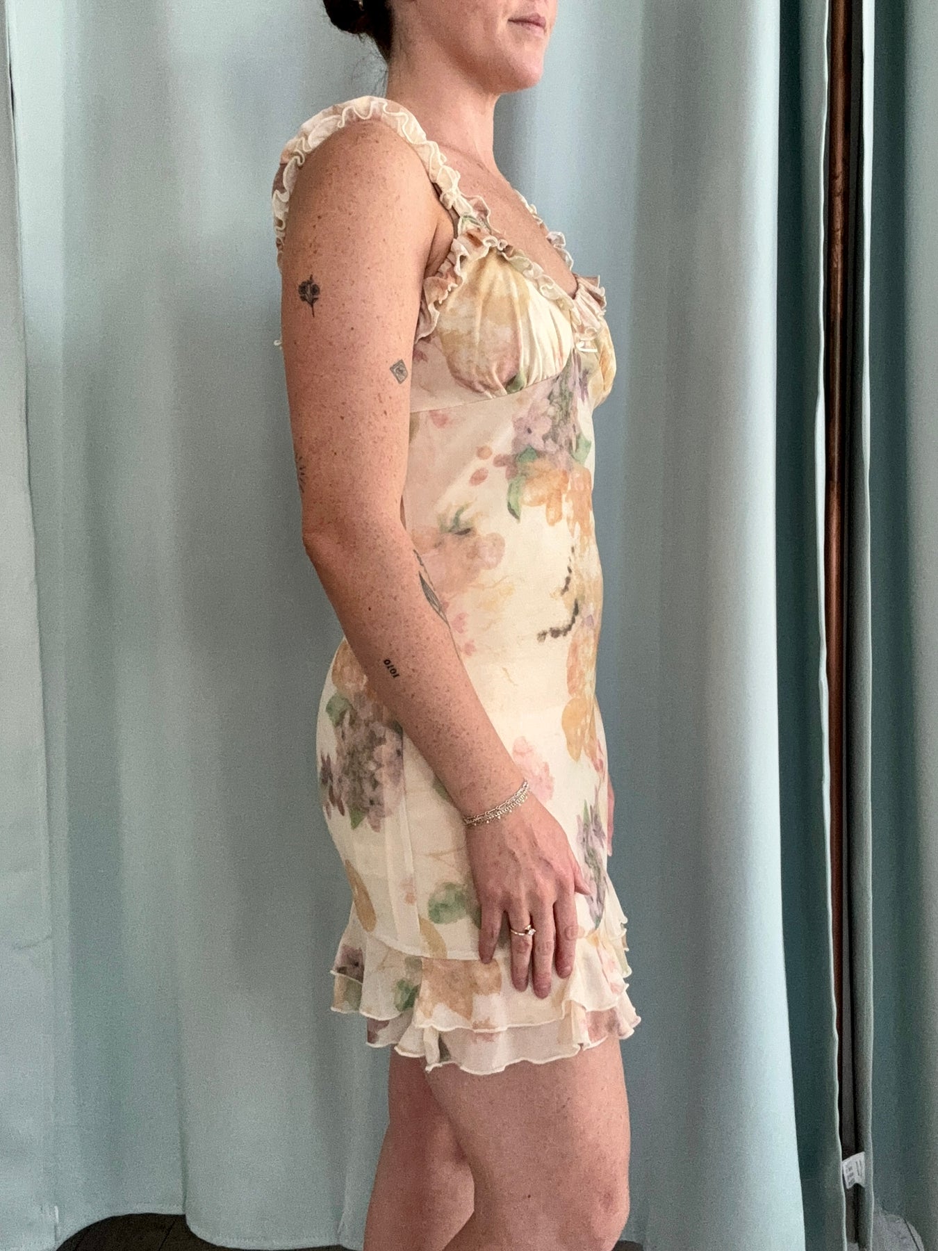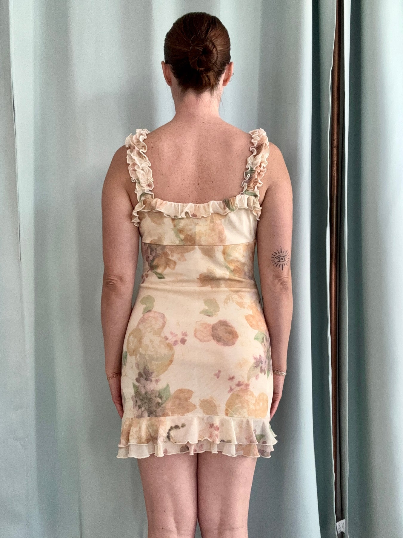 The dreamy Watercolor Ruffle Mini dress is a soft blend of muted yellow, orange, green, and purple—like a sunset melting into fall. The ruffled trim adds just the right amount of flounce, while the lightweight mesh keeps it playful and breathable. Whether you're pairing it with cowboy boots, sneakers, or kitten heels, this is the kind of piece that carries you effortlessly from late summer into cozy autumn days.