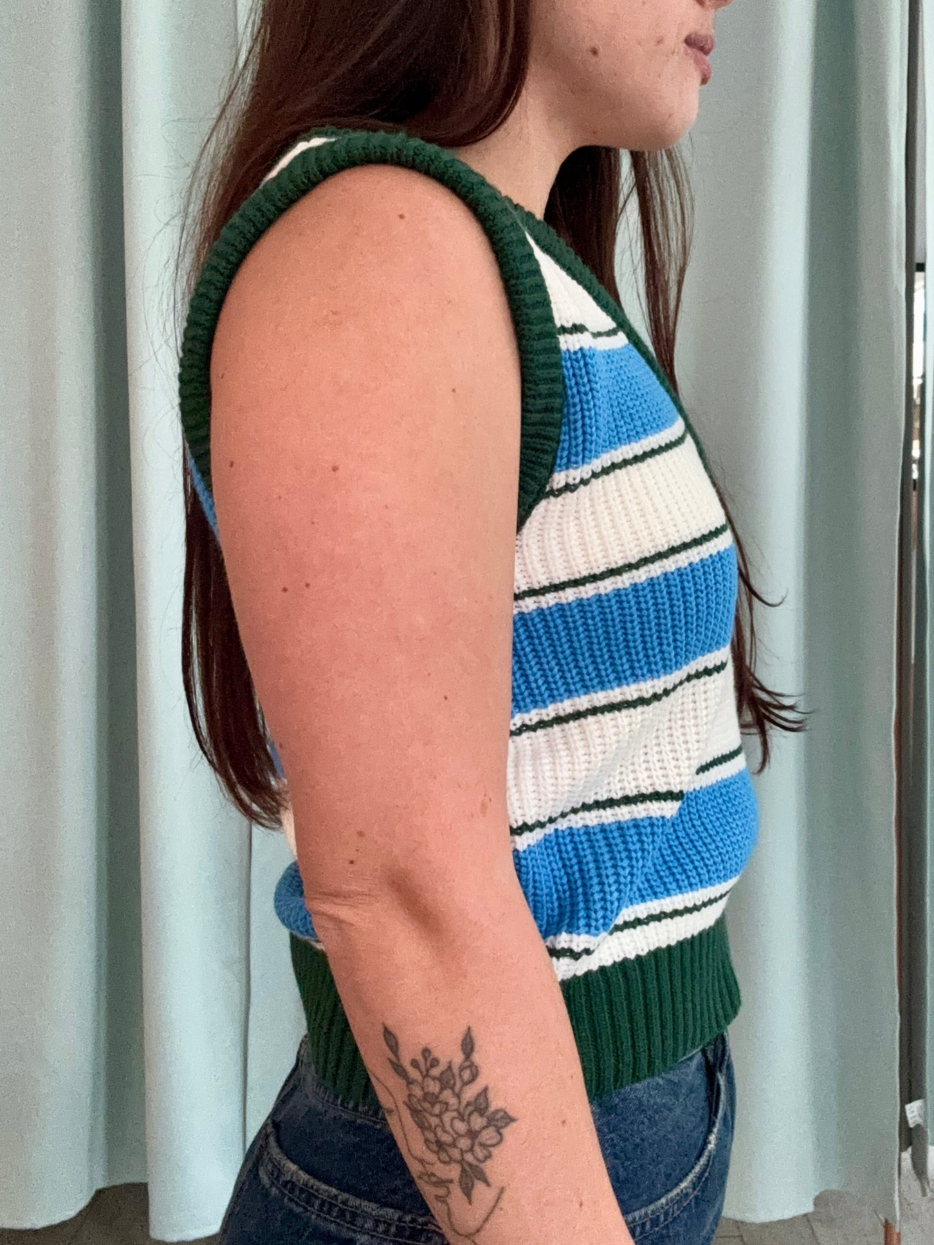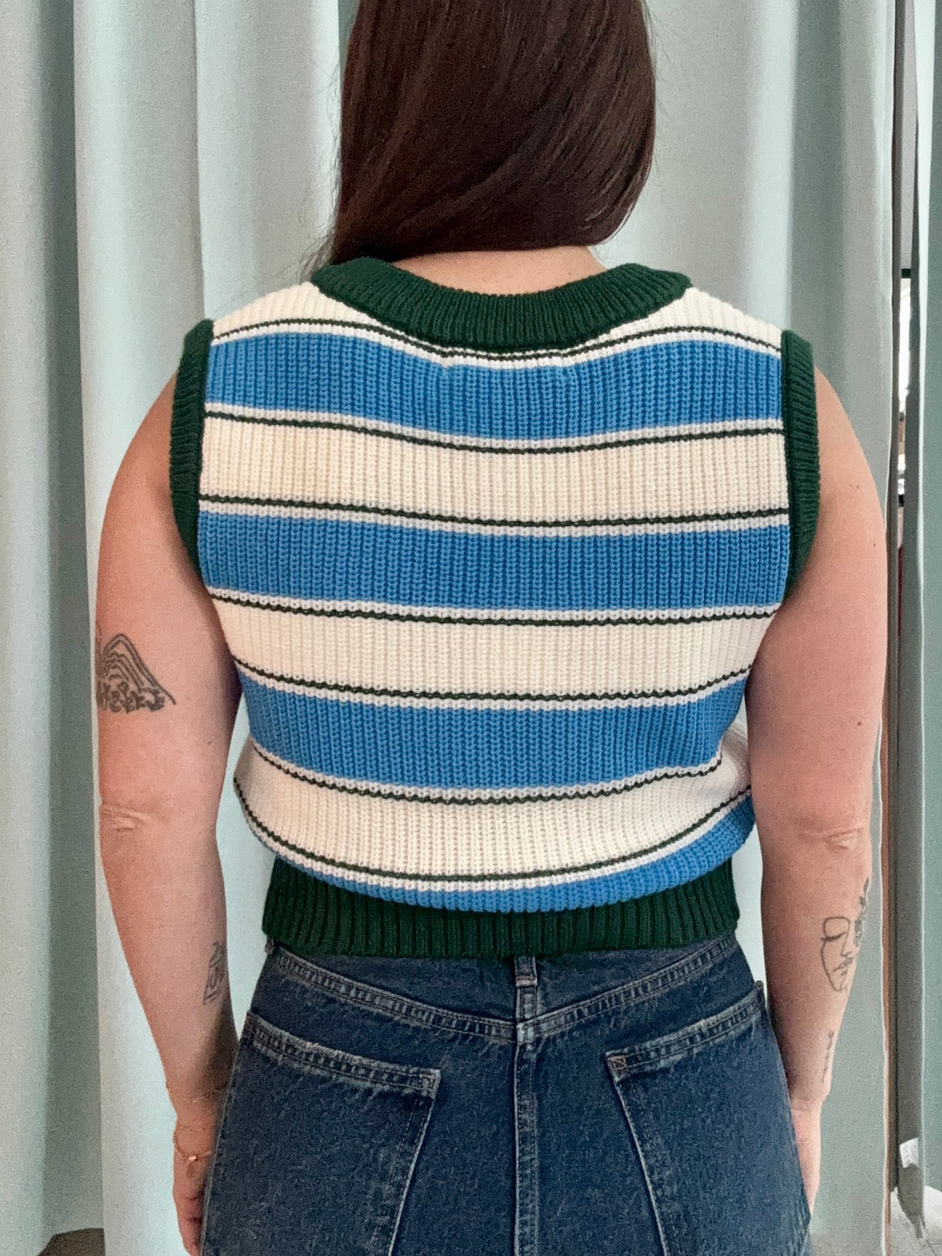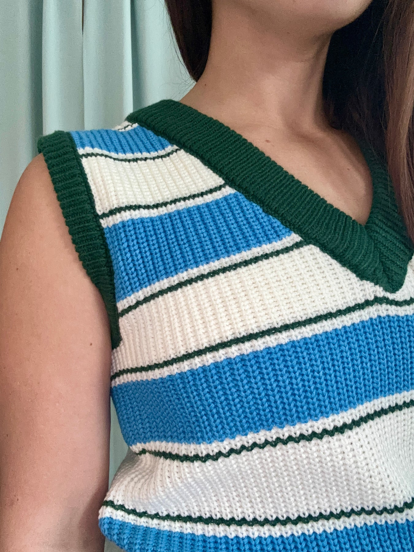 Elevate your layering game with this cozy, retro-inspired sweater vest. With bold blue and white stripes, accented by deep green trim, it's the perfect mix of classic prep and playful charm. Throw it over a crisp button-down, pair it with your favorite jeans, or style it solo for an effortlessly chic vibe. Soft, breathable knit means all-day comfort - because looking cute shouldn't be a trade-off!