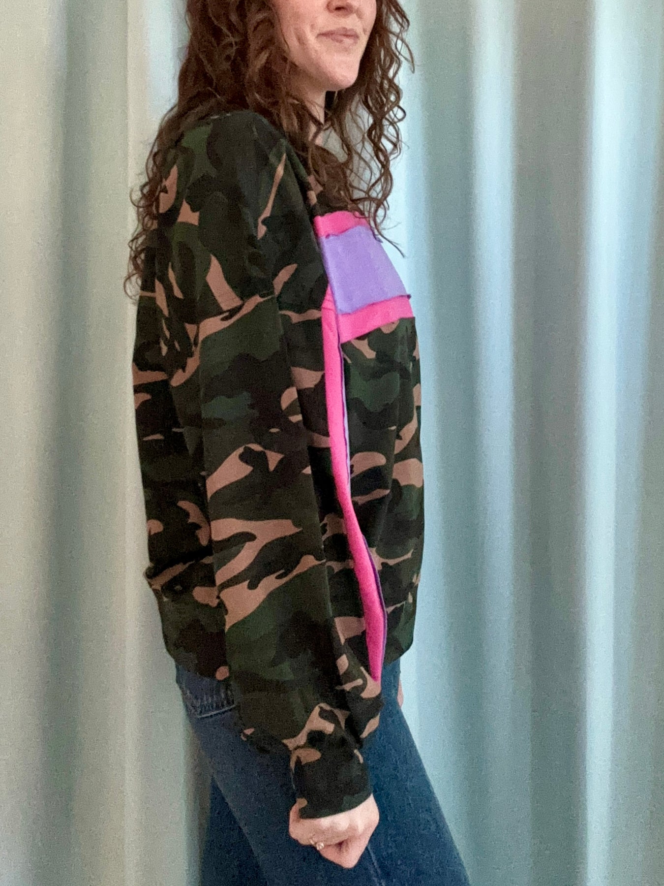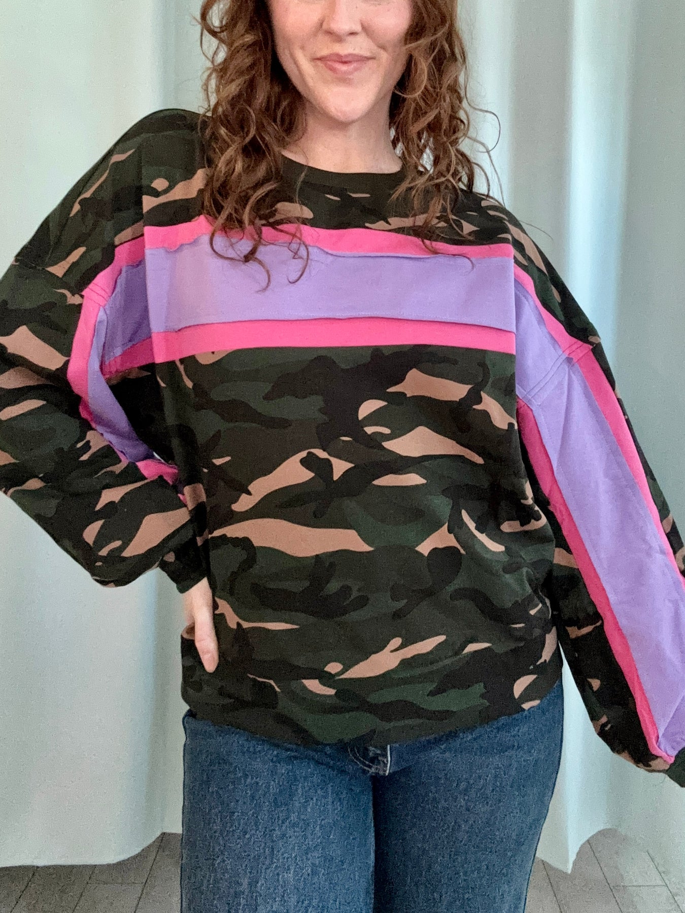 The Camo French Cut Top is giving peak girly-meets-edgy vibes. The classic camo print sets the cool, laid-back tone, while the bold purple block across the front and playful pink block on top bring the sweetest pop of femininity. It’s the perfect blend of tough and cute, making an everyday basic feel totally fresh. Easy, fun, and effortlessly girlified.
