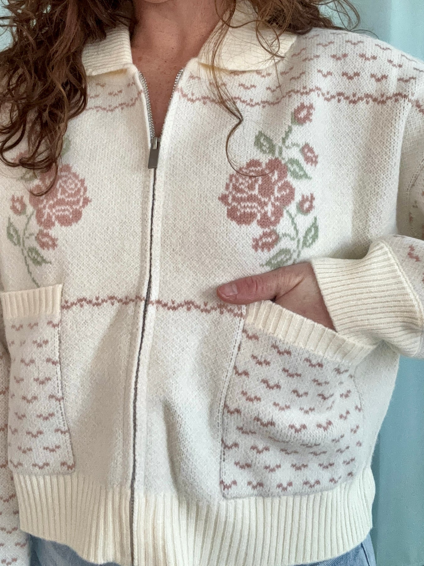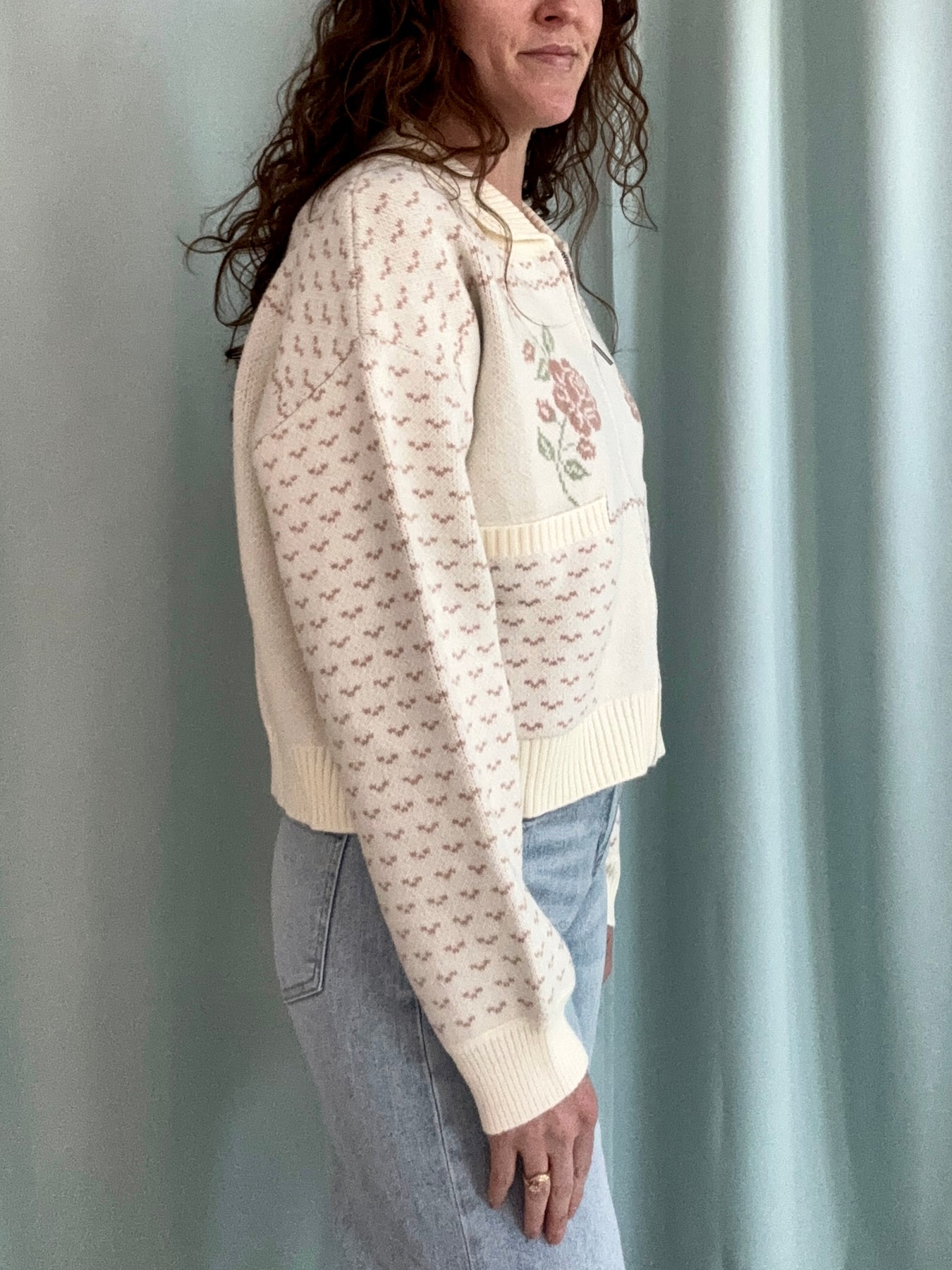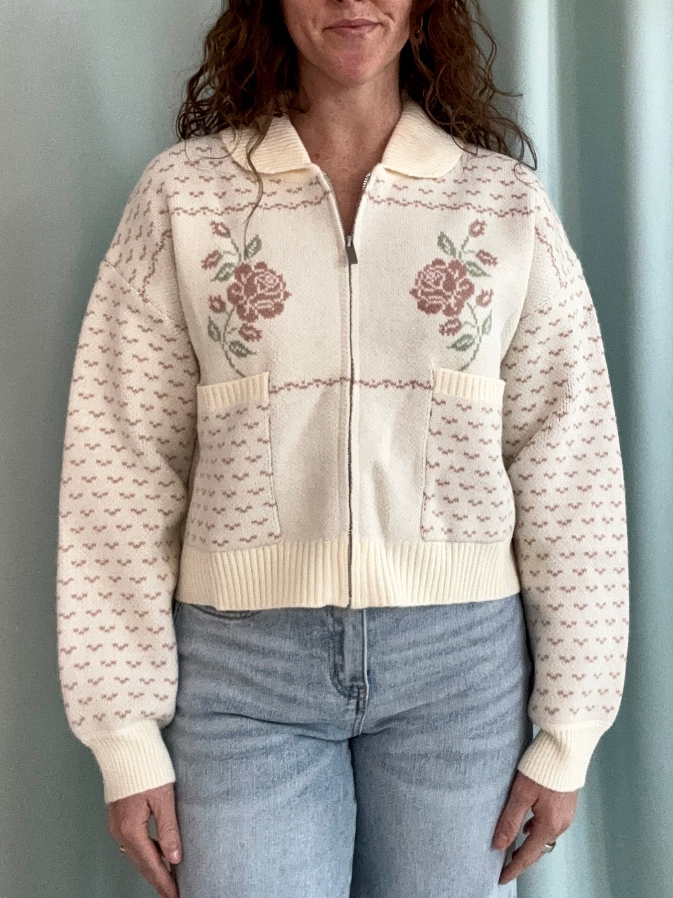 The Rose Knit Jacket feels like something pulled straight from a storybook cottage. Designed in a creamy white knit with a classic zip-up front, it’s cozy, soft, and full of charm. Pink floral detailing adds the sweetest touch, with cross-stitch–inspired patterns along the sleeves and front pockets that give it that handcrafted, heirloom feel.