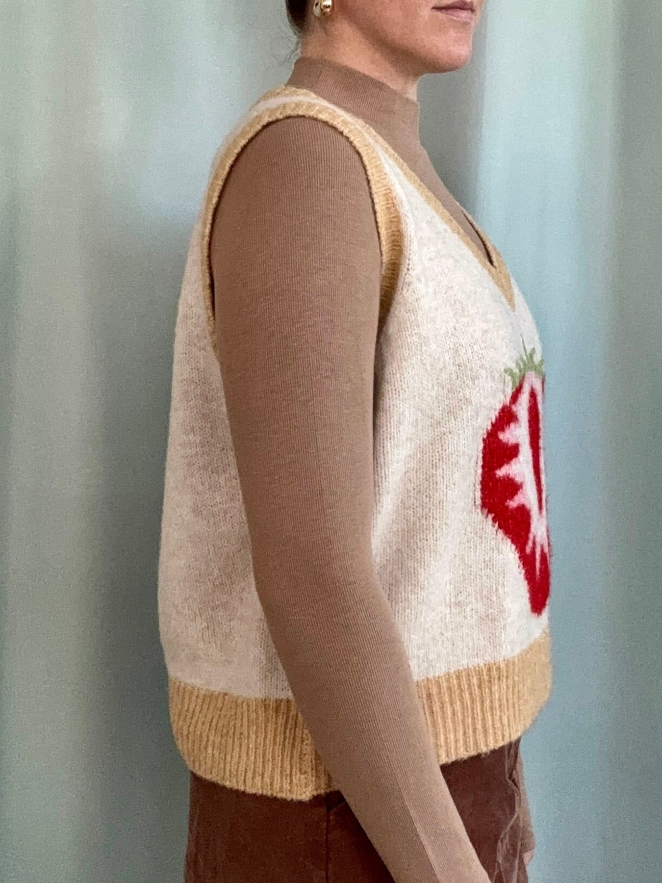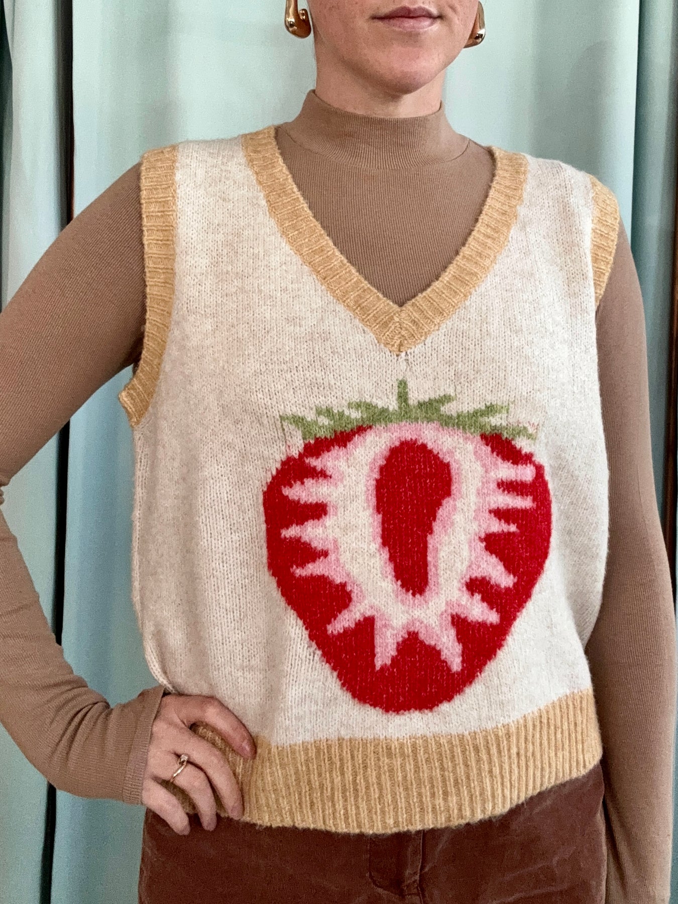 Sweeten up your sweater game with the Strawberry Vest. This cozy knit has an oversized fit and a bold strawberry graphic that brings all the fun, fruity vibes. Soft and slightly slouchy, it layers perfectly over a crisp button-down or your favorite tee. Cute, comfy, and guaranteed to make any outfit pop.