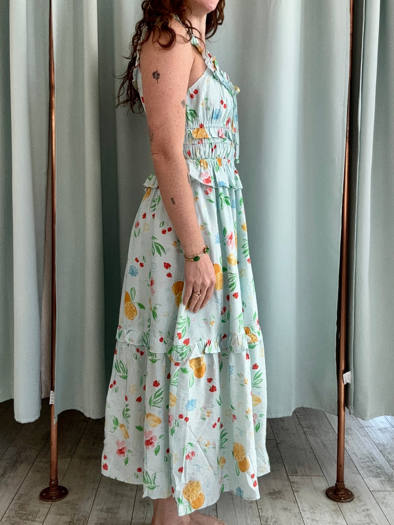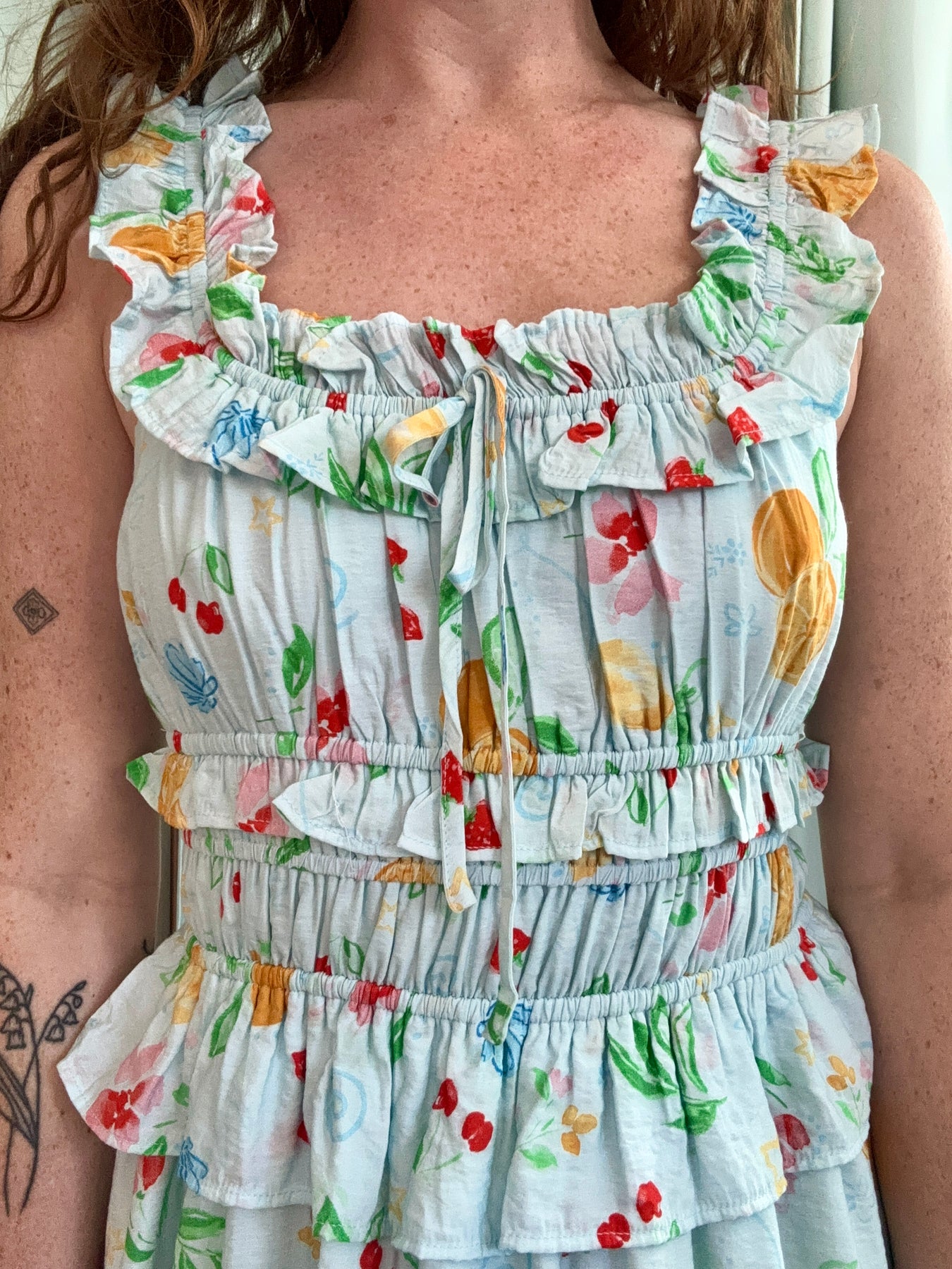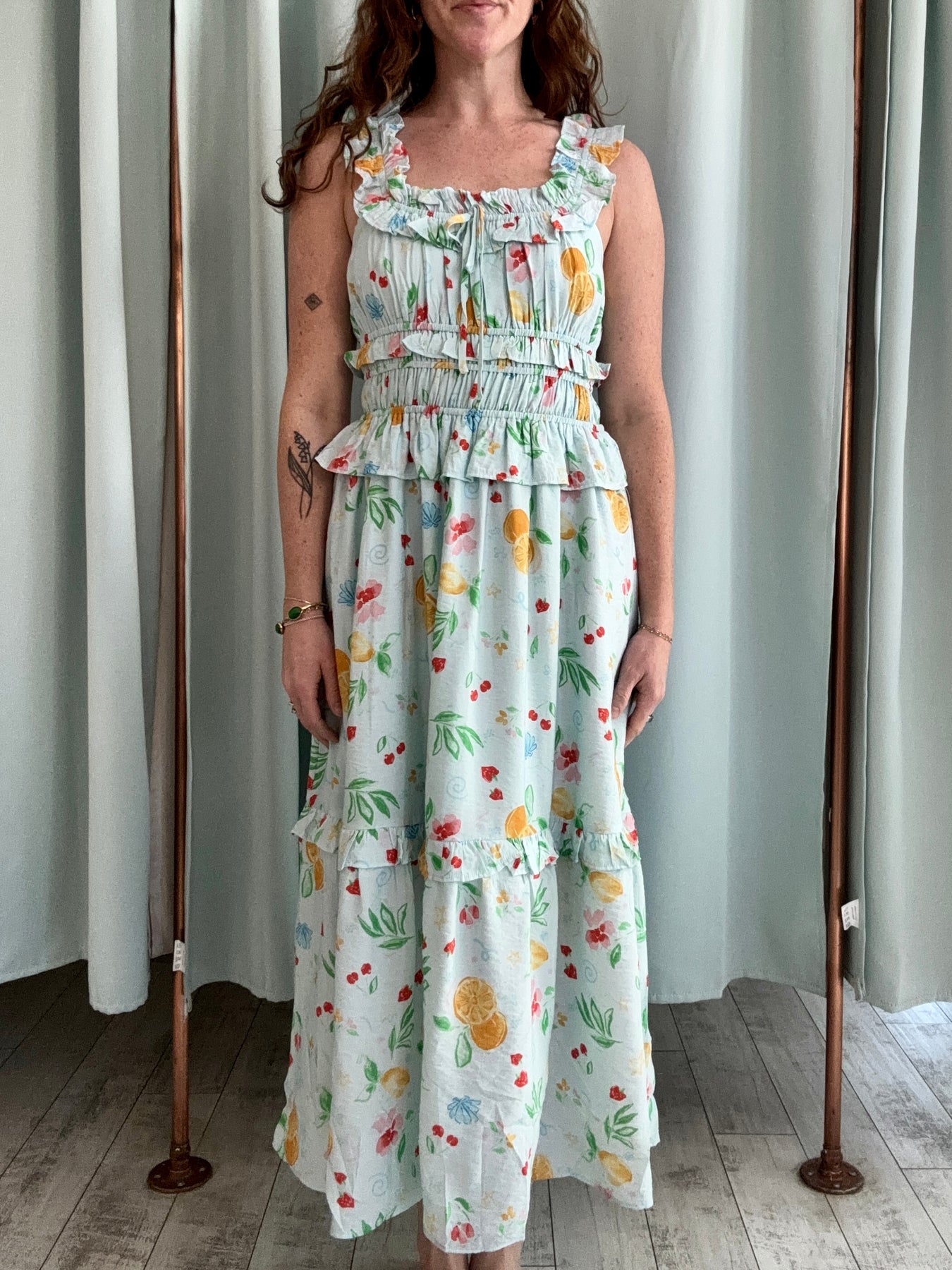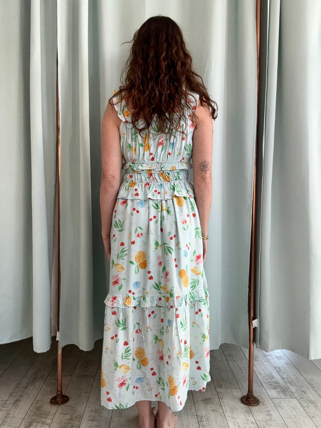 Bring a fresh, playful feel to your wardrobe with this dreamy maxi dress. Designed with a soft light blue base, it’s adorned with delicate floral and fruit-inspired prints that give it a whimsical, sunshine-ready vibe. The thick tank straps feature subtle ruffled detailing, adding a feminine touch, while the ruched bust flatters and accentuates the waist in all the right places.