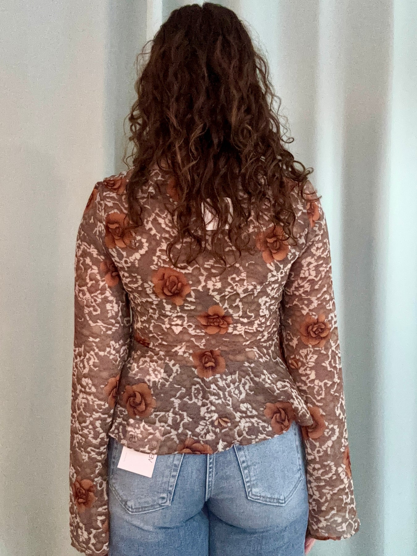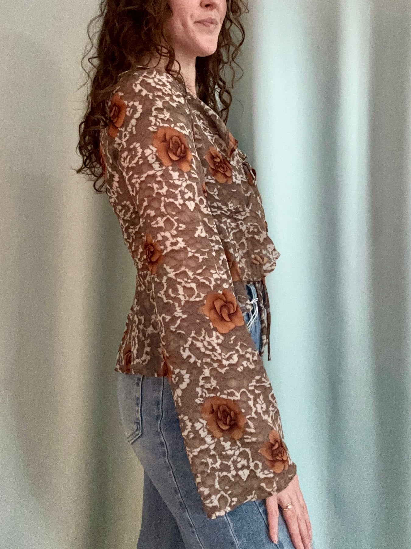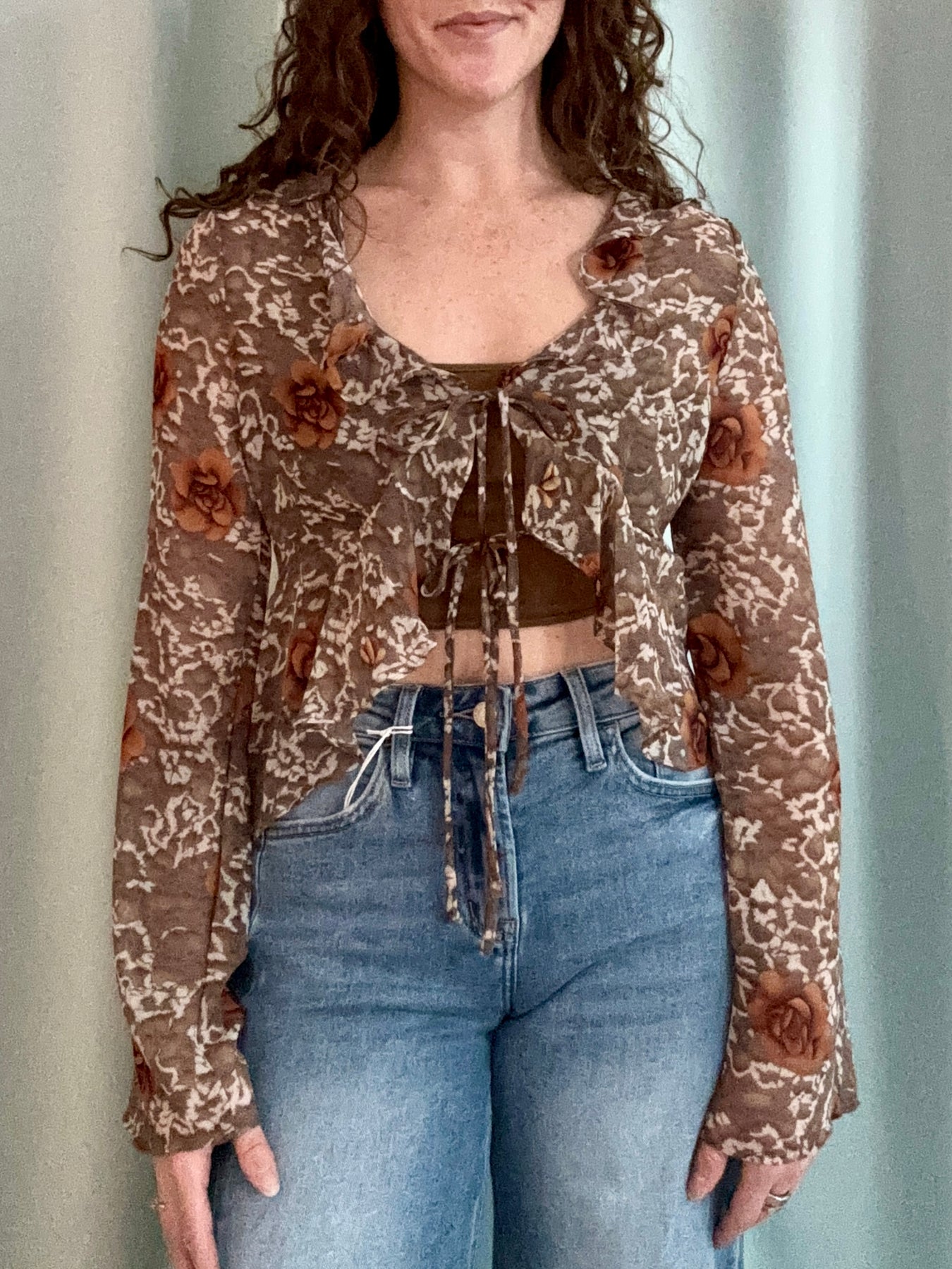This lightweight mesh top drapes effortlessly, while the double tie-front closure adds movement and a touch of vintage charm. Long sleeves keep the look balanced and elegant, and the slightly cropped silhouette pairs perfectly with high-waisted denim or skirts. Whether you’re dressing up for date night or adding something special to your everyday look, this top brings all the dreamy vibes.